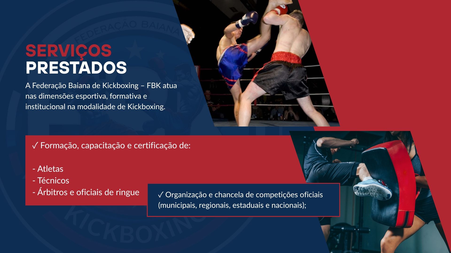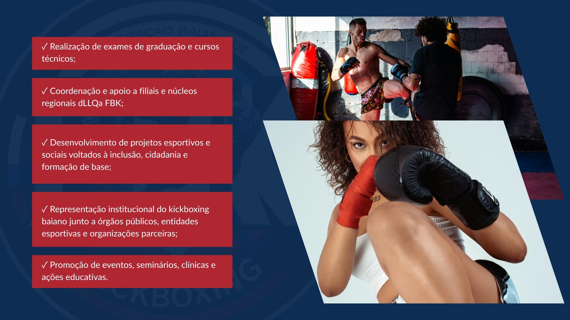 ✅ Representação institucional do kickboxing baiano junto a órgãos públicos, entidades esportivas e organizações parceiras;